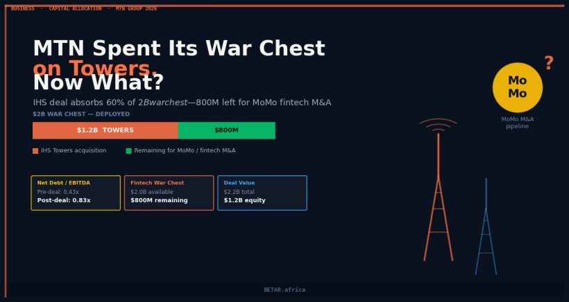 MTN’s $2.2 billion IHS Towers acquisition consumes 60 percent of the fintech war chest Ralph Mupita unveiled just six weeks earlier. BETAR analyses what the deal does to the balance sheet, whether the dividend holds, and how much runway is left for the MoMo platform ambitions that defined MTN’s 2026 strategy narrative.
